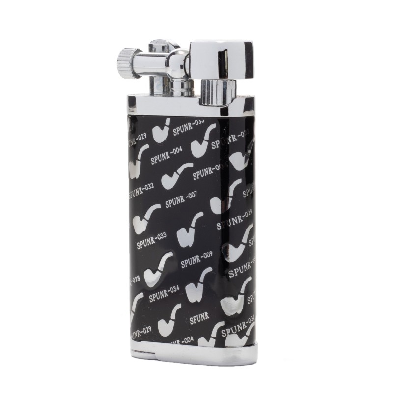 Lubinski Professor Flint Pipe Lighter, Soft Flame 45°, with Pipe Tamper, Color: Black Lacquer & Silver Pipes.