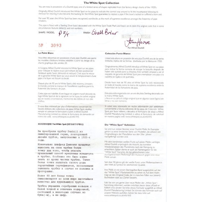 Dunhill The White Spot P F/T Shell Briar Sandblasted, Nº 3093, Year 2021, True in Silver, without filter, Warranty Certificate and Authenticity, original box.