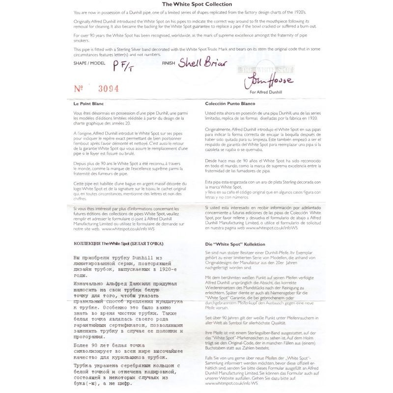 Dunhill The White Spot P F/T Shell Briar Sandblasted, Nº 3094, Year 2021, True in Silver, without filter, Warranty Certificate and Authenticity, original box.