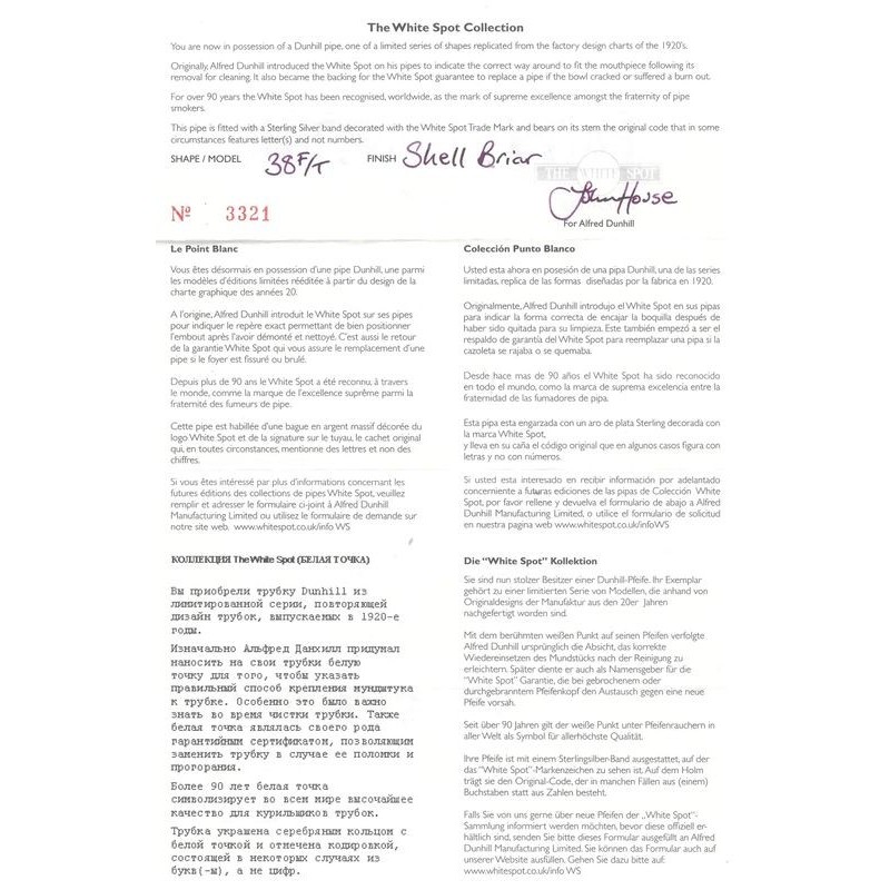 Dunhill The White Spot 38 F/T Shell Briar Sandblasted, Nº 3321, Year 2021, True in Silver, saddle stem, without filter, Warranty Certificate and Authenticity, original box.