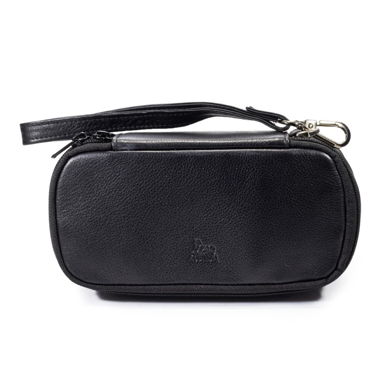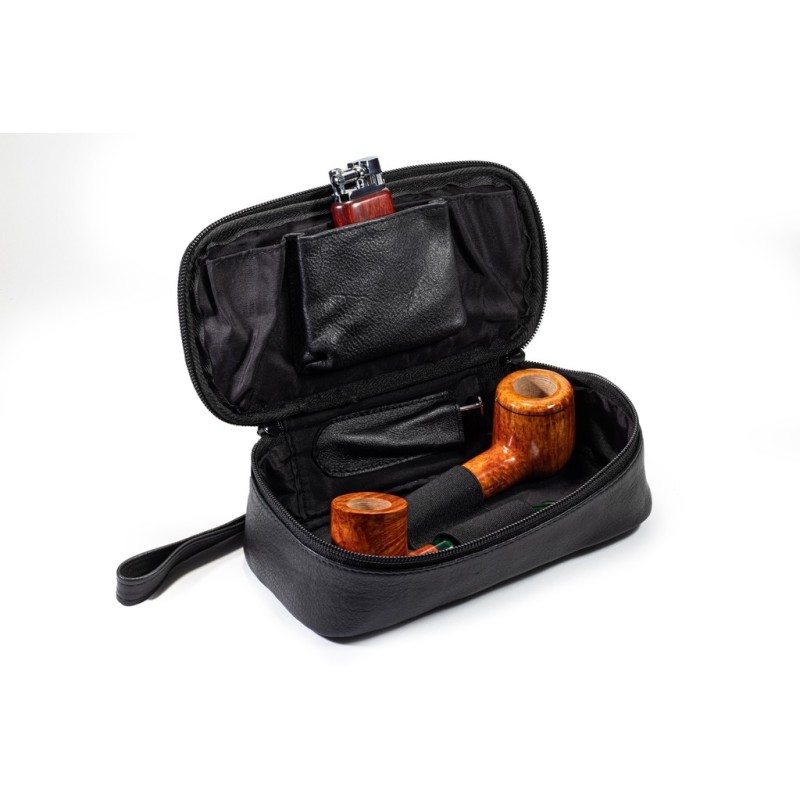 Pipe Bag in Nappa leather for 2 pipes, 1 zip, 2 holders for tobacco and ligher, 1 compartment for tobacco stopper, Color: Black.
