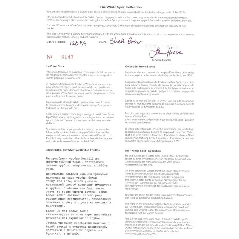 Dunhill The White Spot 120 F/T Shell Briar Sabbiata, Nº 3147, Anno 2021, Vera in Argento, senza filtro, Certificato di Garanzia e Autenticità, scatola originale.