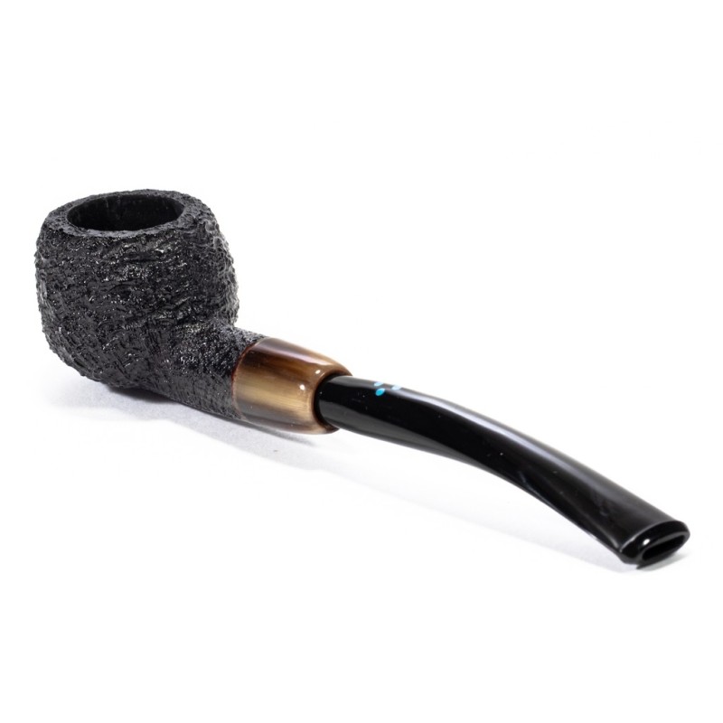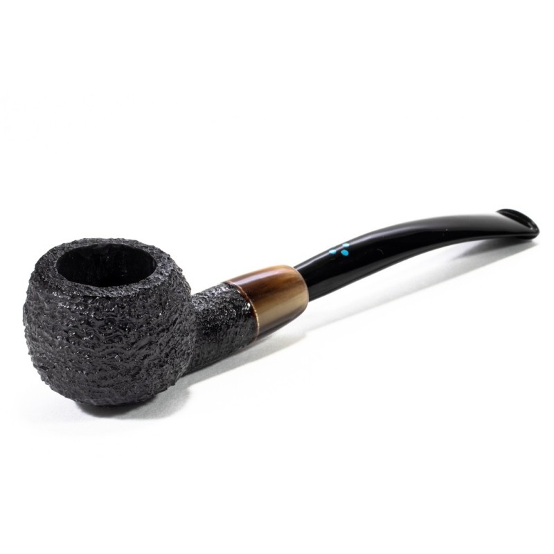 Sasieni 4 Dot Dark Ruff Sabbiata, Colore: Nero, Cannello e bocchino leggermente arcuati, Vera in Corno, Innesto a Flock, Borsa Portapipa Sasieni Inclusa, senza filtro.