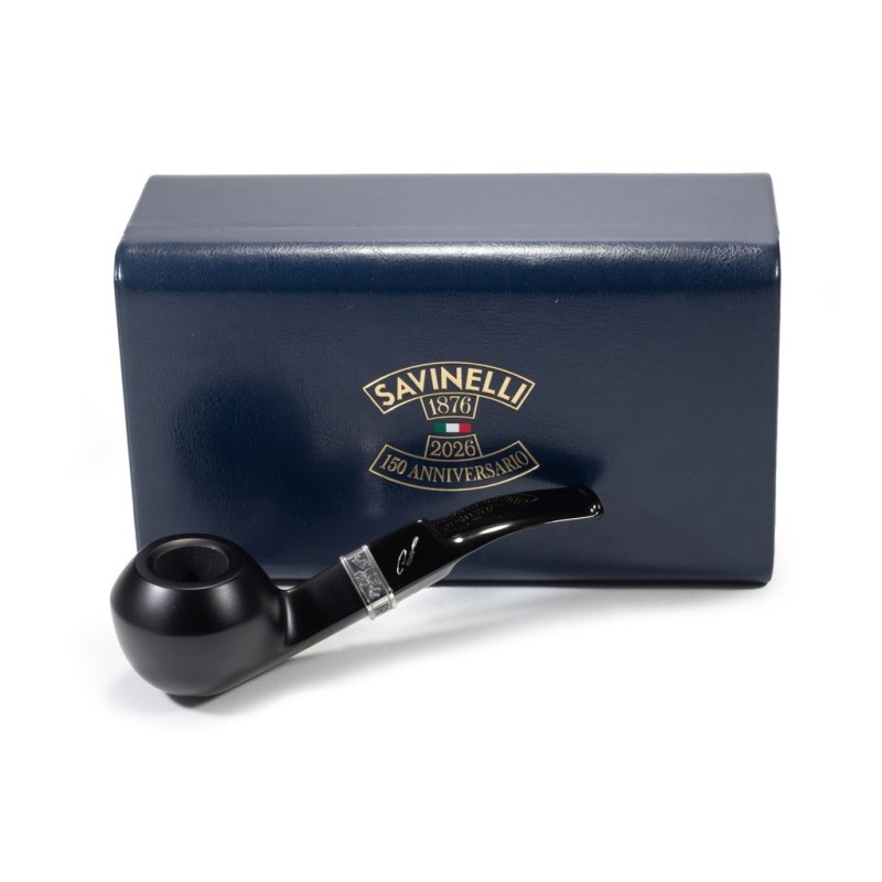 Savinelli 150° Anniversario Carlo Liscia, Pipa N° 25 di 50, Colore: Nero, Vera in Argento con incisioni del Logo Savinelli e Anniversario, bocchino a sella, senza filtro, scatola e sacchetto originale, Made in Italy.